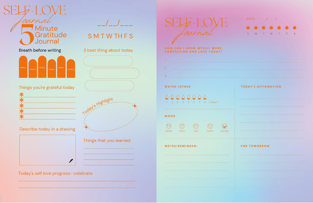 Writing in a self love journal is like having a secret therapist or tool that helps you grow your self-love garden. It's all about taking time to think over what we feel, why we feel it and the things happening around us. This way, we get good insights into how we're doing on our journey of loving ourselves more. By keeping up with this habit daily, you start noticing patterns in your behavior, figure out where you need to improve, and pat yourself on the back for your progress.